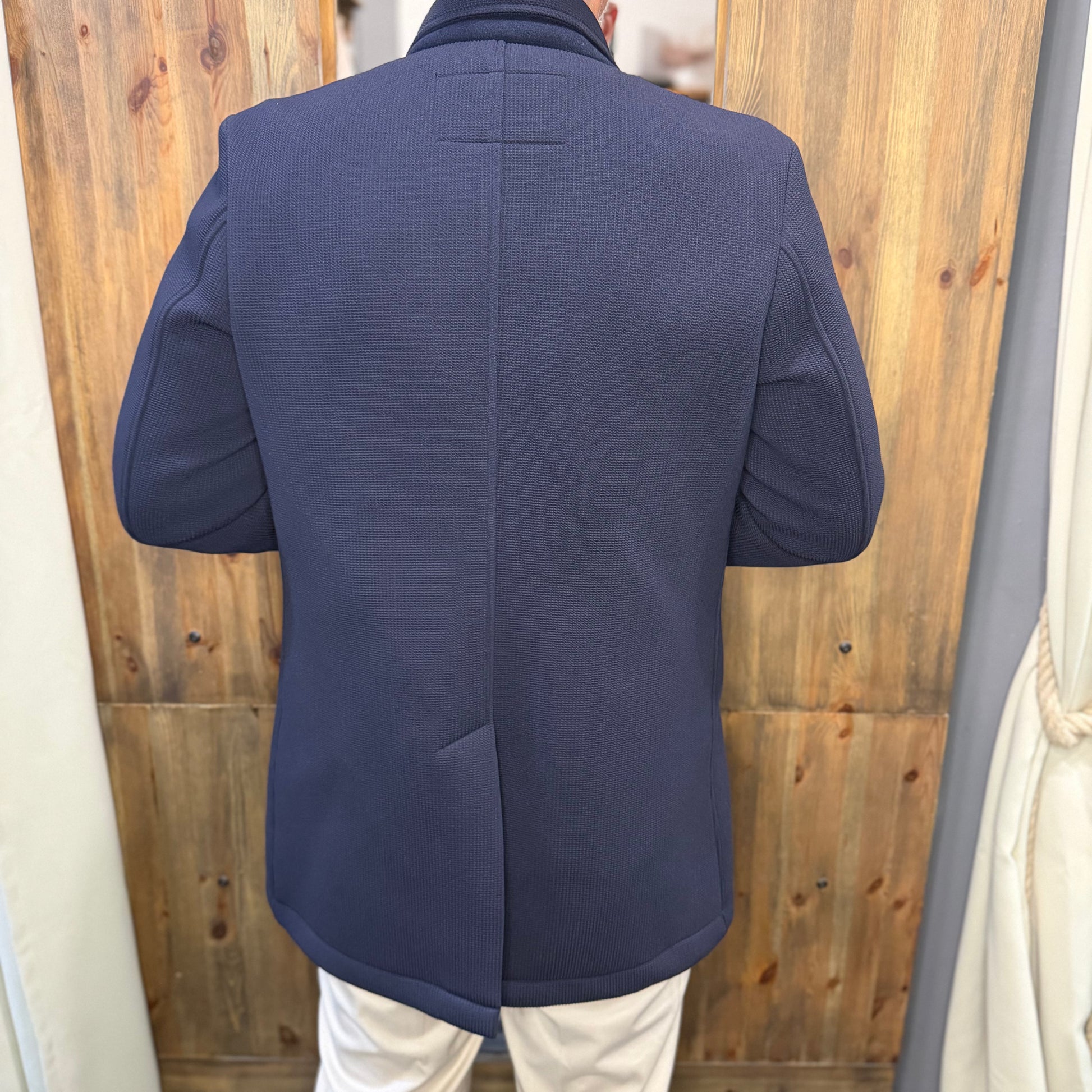 Realizzato in un blu navy profondo, è dotato di chiusura frontale a tre bottoni, tasche laterali a filetto e taschino sul petto, dettagli che donano equilibrio e sobrietà al design.