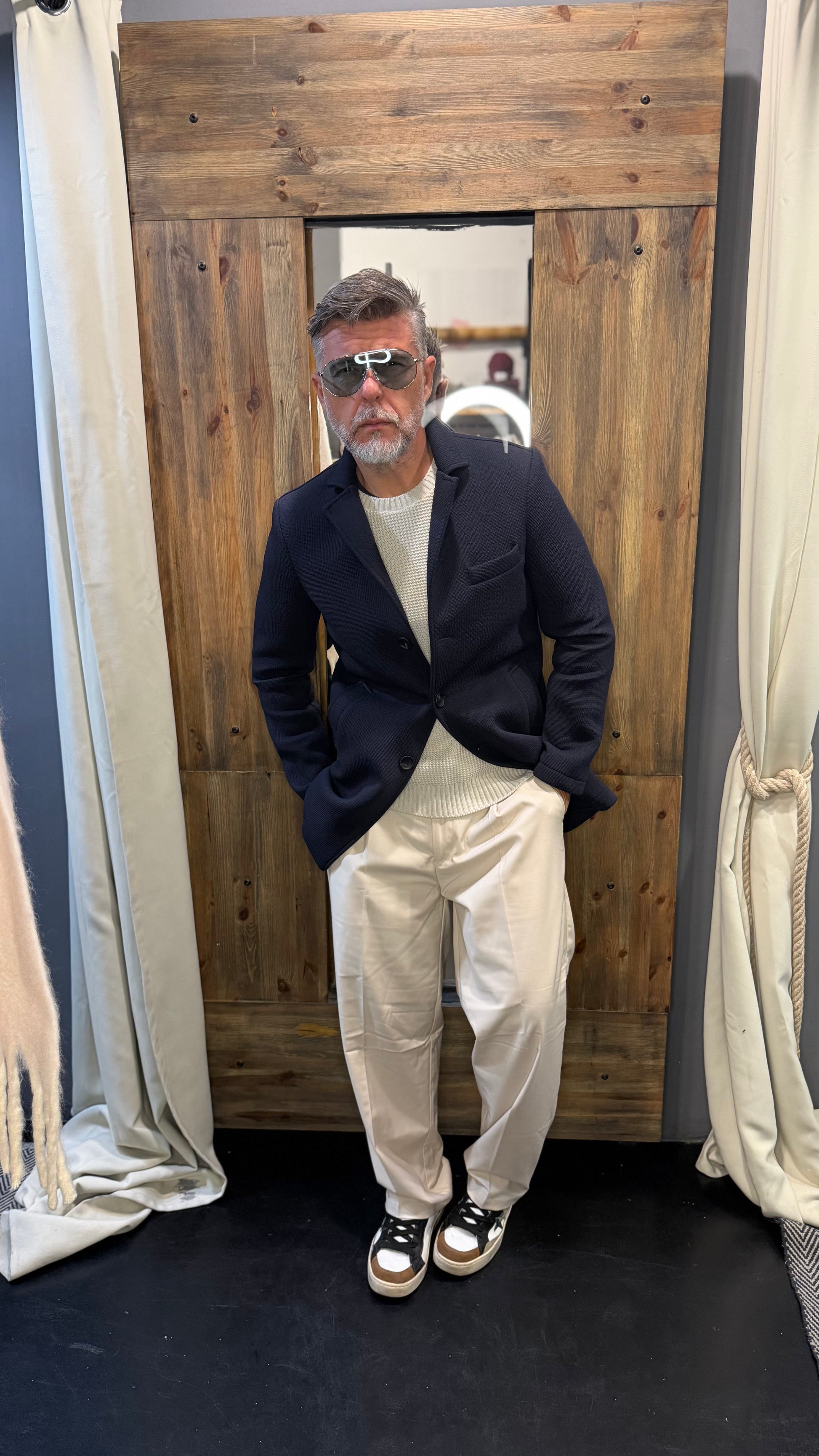 Il tessuto, morbido e compatto, garantisce comfort e ottima vestibilità, adattandosi con naturalezza al corpo. Ideale per le giornate più fresche, si abbina con facilità sia a look casual con jeans e maglione, sia a outfit più formali con camicia e pantalone classico.