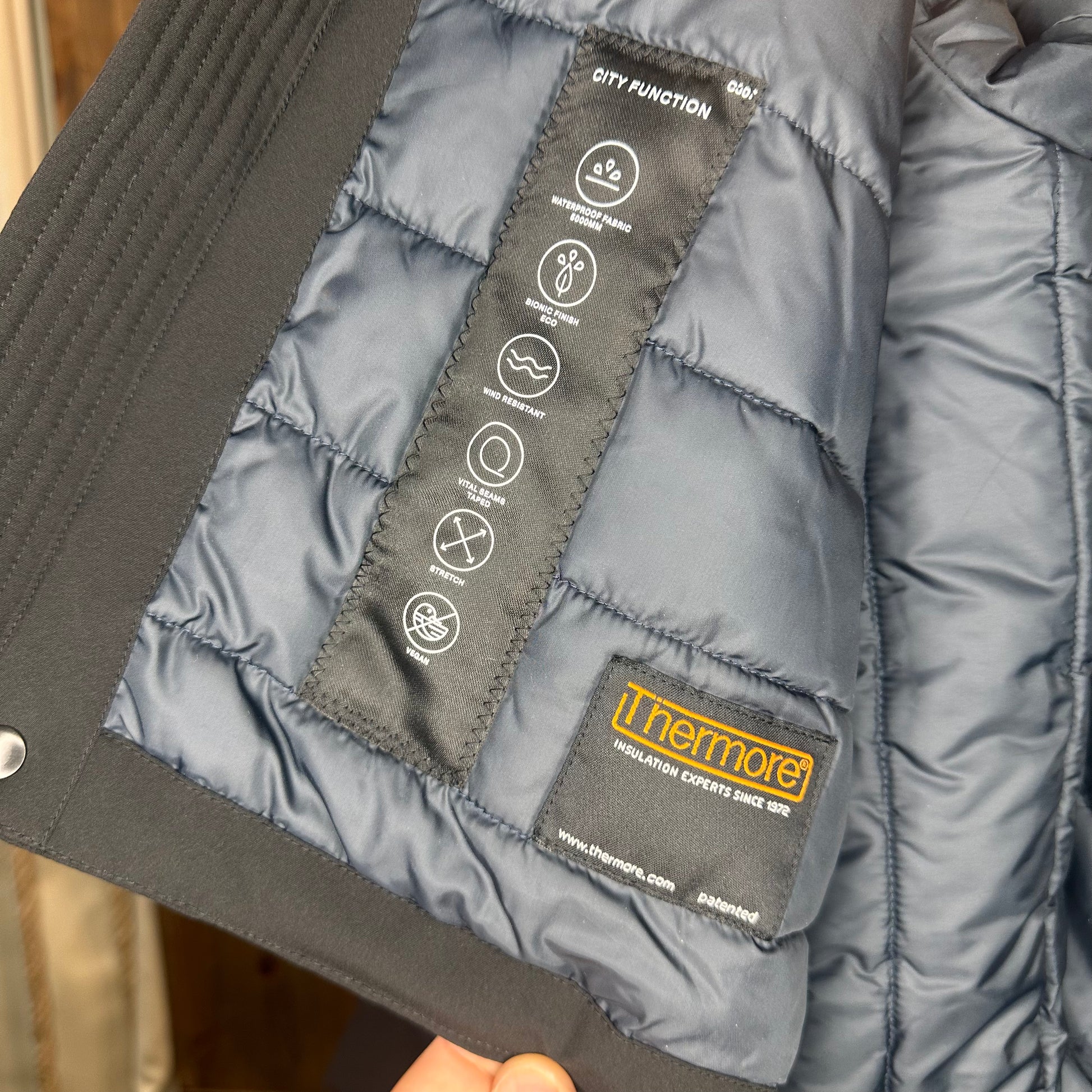 5K. Il materiale è ad asciugatura rapida e legato con una membrana impermeabile che protegge dagli acquazzoni improvvisi. L'elasticità a quattro vie aggiunge comfort mentre una brillante elasticità del colore mantiene il look fresco della giacca da una stagione all'altra. La giacca è foderata con imbottitura Thermore riciclata al 100% e vegana, che fornisce calore e imita la sensazione di vero piumino. I dettagli includono cuciture con nastro adesivo vitali e tasche con zip con tessuto a contrasto tonale. Vhinner porta un aspetto sofisticato e attivo ai freddi inverni di città. Il modello è alto 183 cm e indossa una taglia L
