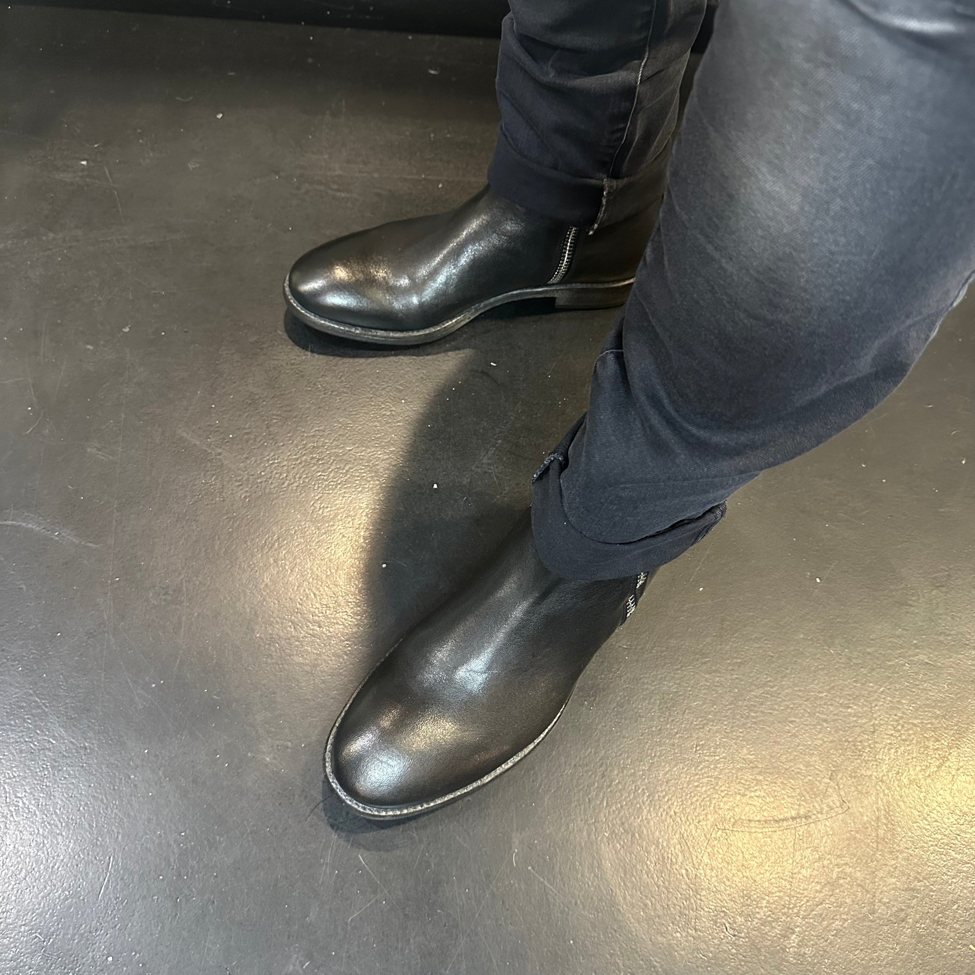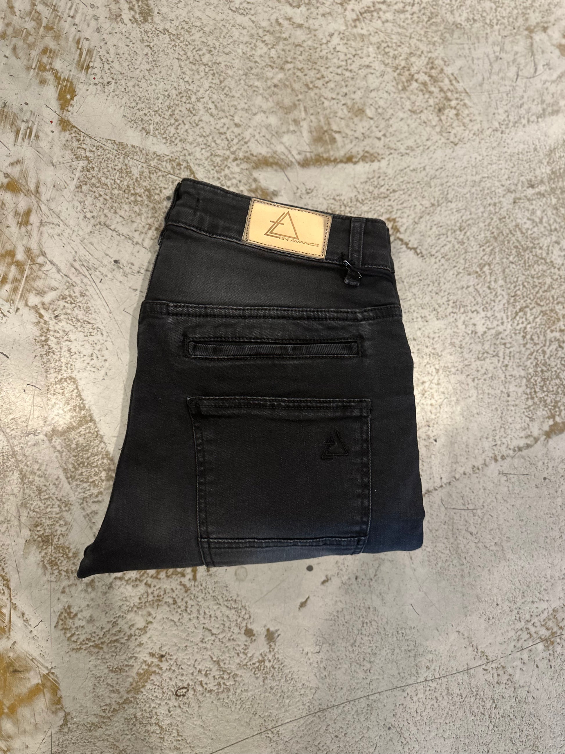 - Colore: Nero slavato tendente al grigio antracite, con schiariture localizzate su cosce, ginocchia e parte superiore delle gambe. Questo effetto dona profondità e un aspetto vissuto, ma raffinato.